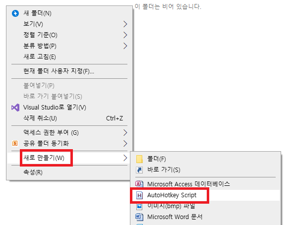폴더에서 마우스 우클릭 >> 새로 만들기 >> AutoHotkey Script를 클릭합니다.
