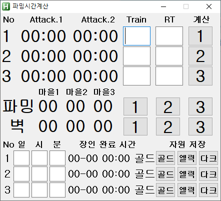 Gui, Font, Bold ; 아래 텍스트 강조 Gui, Font, s12 ; 아래 텍스트 폰트 크기 ; Gui, Add(추가), text(텍스트박스), x좌표 y좌표 넓이 높이, 내용 ; 프로그램 좌표 (5, 5)에 넓이 450, 높이 20인 텍스트상자를 추가한다는 내용 Gui, Add, Text, x5 y5 w440 h20 ,No Attack.1 Attack.2 Train RT 계산 Gui, Add, Text, x75 y150 w240 h20 ,마을1 마을2 마을3 Gui, Add, Text, x5 y255 w440 h20 ,No 일 시 분 장인 완료 시간 자원 저장 Gui, Font, s25 ; 마을 No Gui, Add, Text, x2 y30 w30 h40 , 1 Gui, Add, Text, x2 y70 w30 h40 , 2 Gui, Add, Text, x2 y110 w30 h40 , 3 ; 공격1, 공격2 시간 Gui, Add, Text, x40 y30 w200 h40 vAttackTime1, 00:00 00:00 Gui, Add, Text, x40 y70 w200 h40 vAttackTime2, 00:00 00:00 Gui, Add, Text, x40 y110 w200 h40 vAttackTime3, 00:00 00:00 ; 훈련시간 에디터 박스 Gui, Add, Edit, x245 y27 w55 h38 vTrTime1, Gui, Add, Edit, x245 y67 w55 h38 vTrTime2, Gui, Add, Edit, x245 y107 w55 h38 vTrTime3, ; 현재 남은시간 에디터박스 Gui, Add, Edit, x310 y27 w55 h38 vRTTime1, Gui, Add, Edit, x310 y67 w55 h38 vRTTime2, Gui, Add, Edit, x310 y107 w55 h38 vRTTime3, ; 계산버튼 Gui, Add, Button, x375 y26 w50 h40 gCC1, 1 Gui, Add, Button, x375 y66 w50 h40 gCC2, 2 Gui, Add, Button, x375 y106 w50 h40 gCC3, 3 ; 파밍, 마을1, 마을2, 마을3에 개수 전시 Gui, Add, Text, x2 y170 w70 h40 , 파밍 Gui, Add, Text, x75 y170 w50 h40 vPamingCount1, 00 Gui, Add, Text, x130 y170 w50 h40 vPamingCount2, 00 Gui, Add, Text, x185 y170 w50 h40 vPamingCount3, 00 ; 벽업그레이드 개수 전시 Gui, Add, Text, x17 y210 w50 h40 , 벽 Gui, Add, Text, x75 y210 w50 h40 vWallCount1, 00 Gui, Add, Text, x130 y210 w50 h40 vWallCount2, 00 Gui, Add, Text, x185 y210 w50 h40 vWallCount3, 00 ; 파밍횟수 버튼 Gui, Add, Button, x245 y168 w50 h38 gPA1, 1 Gui, Add, Button, x310 y168 w50 h38 gPA2, 2 Gui, Add, Button, x375 y168 w50 h38 gPA3, 3 ; 벽 업그레이드 개수 버튼 Gui, Add, Button, x245 y208 w50 h38 gWA1, 1 Gui, Add, Button, x310 y208 w50 h38 gWA2, 2 Gui, Add, Button, x375 y208 w50 h38 gWA3, 3 Gui, Font, s15 ; 마을 No Gui, Add, Text, x8 y281 w20 h30 , 1 Gui, Add, Text, x8 y312 w20 h30 , 2 Gui, Add, Text, x8 y344 w20 h30 , 3 ; 마을1 장인 완료시간 Day, Hour, Min Gui, Add, Edit, x26 y275 w32 h30 vDvTimeD1, Gui, Add, Edit, x62 y275 w32 h30 vDvTimeH1, Gui, Add, Edit, x98 y275 w32 h30 vDvTimeM1, ; 마을2 장인 완료시간 Day, Hour, Min Gui, Add, Edit, x26 y307 w32 h30 vDvTimeD2, Gui, Add, Edit, x62 y307 w32 h30 vDvTimeH2, Gui, Add, Edit, x98 y307 w32 h30 vDvTimeM2, ; 마을3 장인 완료시간 Day, Hour, Min Gui, Add, Edit, x26 y339 w32 h30 vDvTimeD3, Gui, Add, Edit, x62 y339 w32 h30 vDvTimeH3, Gui, Add, Edit, x98 y339 w32 h30 vDvTimeM3, ; 장인 완료시간 Gui, Add, Text, x135 y281 w240 h40 , 00-00 00:00 골드 Gui, Add, Text, x135 y312 w240 h40 , 00-00 00:00 골드 Gui, Add, Text, x135 y344 w240 h40 , 00-00 00:00 골드 Gui, Font, s12 ; 장인 완료 시간 계산, 필요 자원 골드 Gui, Add, Button, x310 y275 w40 h30 gGold1, 골드 Gui, Add, Button, x310 y307 w40 h30 gGold2, 골드 Gui, Add, Button, x310 y339 w40 h30 gGold3, 골드 ; 장인 완료 시간 계산, 필요 자원 엘릭 Gui, Add, Button, x353 y275 w40 h30 gElixir1, 엘릭 Gui, Add, Button, x353 y307 w40 h30 gElixir2, 엘릭 Gui, Add, Button, x353 y339 w40 h30 gElixir3, 엘릭 ; 장인 완료 시간 계산, 필요 자원 다크 Gui, Add, Button, x396 y275 w40 h30 gDark1, 다크 Gui, Add, Button, x396 y307 w40 h30 gDark2, 다크 Gui, Add, Button, x396 y339 w40 h30 gDark3, 다크 ; 0,0 위치에 크기가 너비가 440 높이가 375인 Gui 전시, 텍스트는 프로그램 이름 Gui, Show, x0 y0 h375 w440, 파밍시간계산 return ; 계산버튼 클릭 시 발생하는 이벤트 CC1: return CC2: return CC3: return ; 파밍 버튼 클릭 시 발생하는 이벤트 PA1: return PA2: return PA3: return ; 벽 업글 버튼 클릭 시 발생하는 이벤트 WA1: return WA2: return WA3: return ; 골드 버튼 클릭 시 발생하는 이벤트 Gold1: return Gold2: return Gold3: return ; 엘릭 버튼 클릭 시 발생하는 이벤트 Elixir1: return Elixir2: return Elixir3: return ; 다크 버튼 클릭 시 발생하는 이벤트 Dark1: return Dark2: return Dark3: return